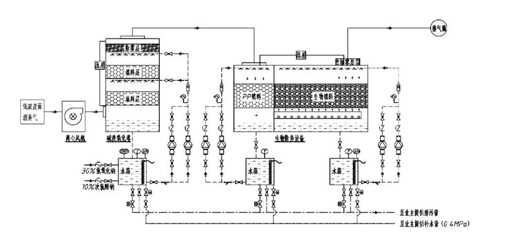 Kombinovaná jednotka biologického čištění a filtrace deodorace integruje tři biologické technologie: biologické čištění, biologickou skrápěcí filtraci a biologickou filtraci. Toto nové kompozitní biologické deodorizační zařízení bylo vyvinuto syntézou výhod těchto tří biologických technik. Zapáchající plyny vstupují do prací zóny přes vstup, kde procházejí předběžnou úpravou vodou nebo koncentrovanými chemickými pracími roztoky. Tato čistící zóna dokončuje absorpci ve vodě rozpustných chemikálií, odstraňování prachu a zvlhčování zapáchajících plynů. Neodstraněné zapáchající plyny pak postupují do vícestupňové filtrační zóny biofiltru. Při průchodu filtrační vrstvou se znečišťující látky přenášejí z plynné fáze na povrch biofilmu: